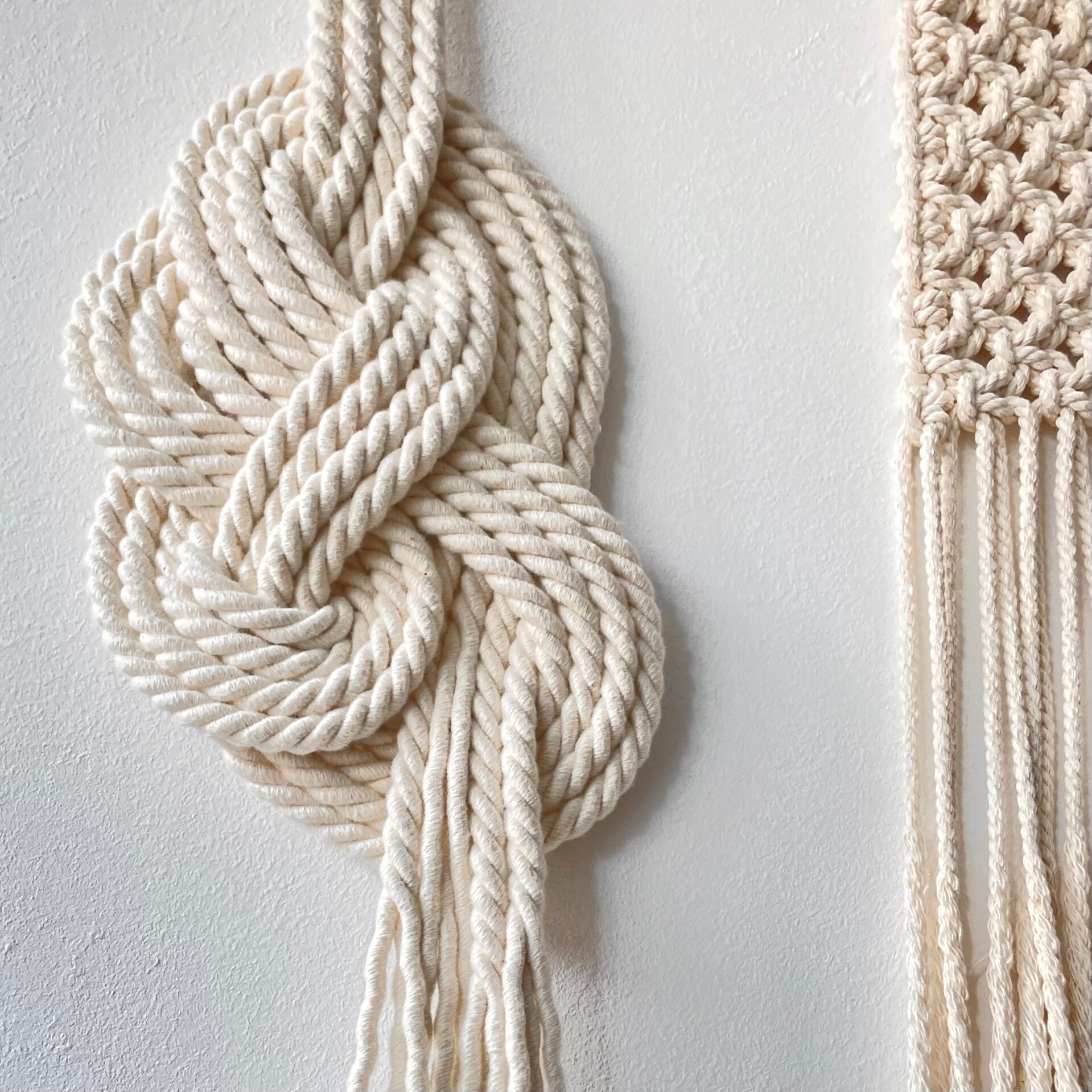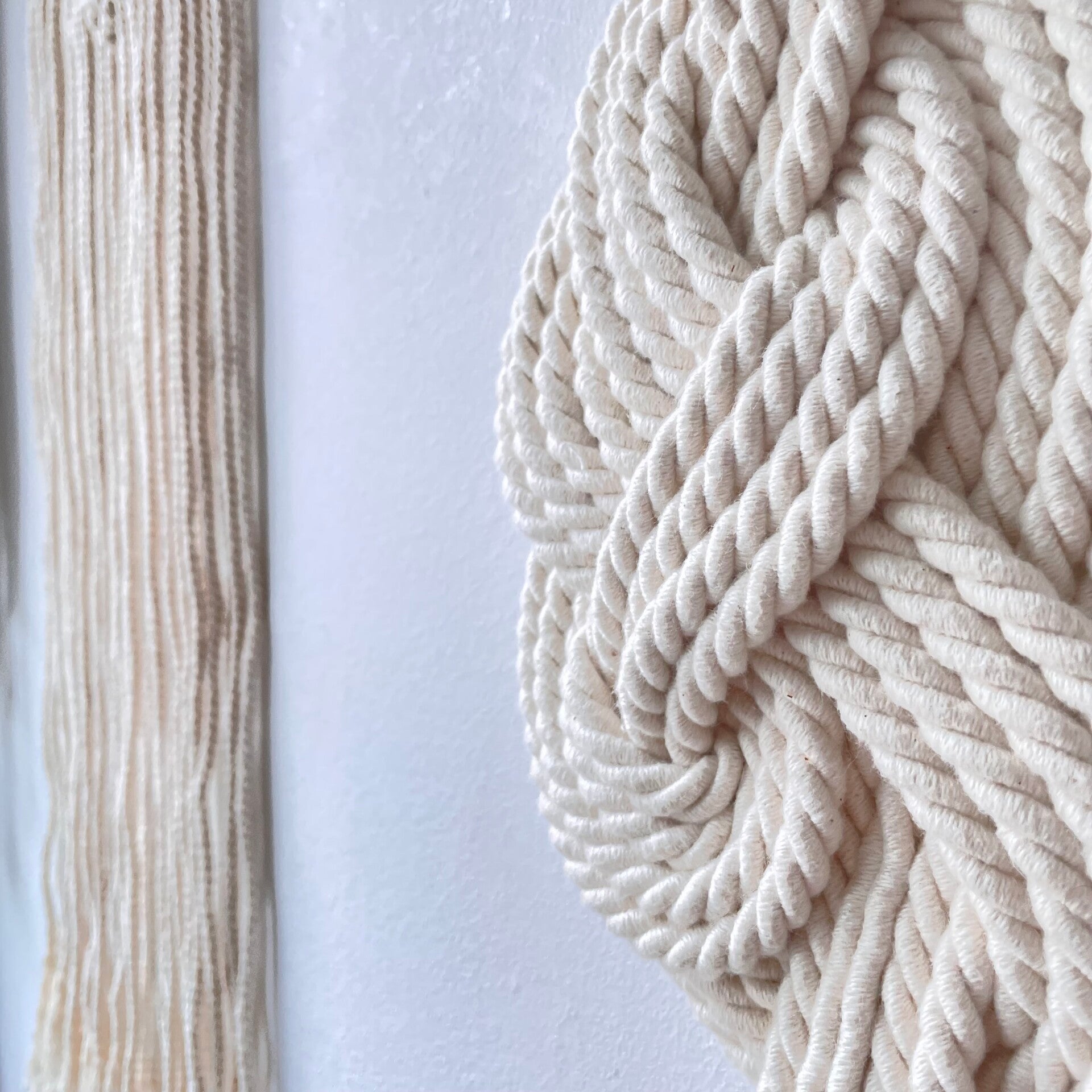 Een grafisch wandstuk met een pure rustige uitstraling. Geknoopt in een strakke platte knoop.